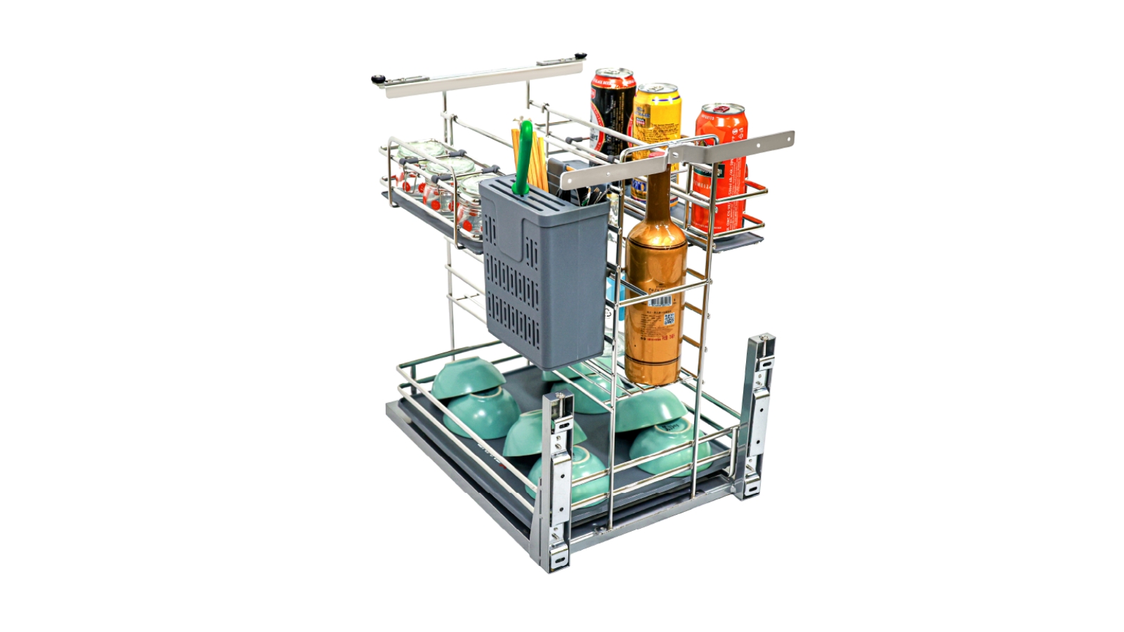 Kệ được thiết kế các tầng nâng hạ theo phương thẳng đứng, giúp người dùng dễ dàng lưu trữ và lấy đồ dùng khi cần. Khi không sử dụng, kệ có thể được đẩy lên và nằm gọn gàng trong phần trên của tủ bếp.
