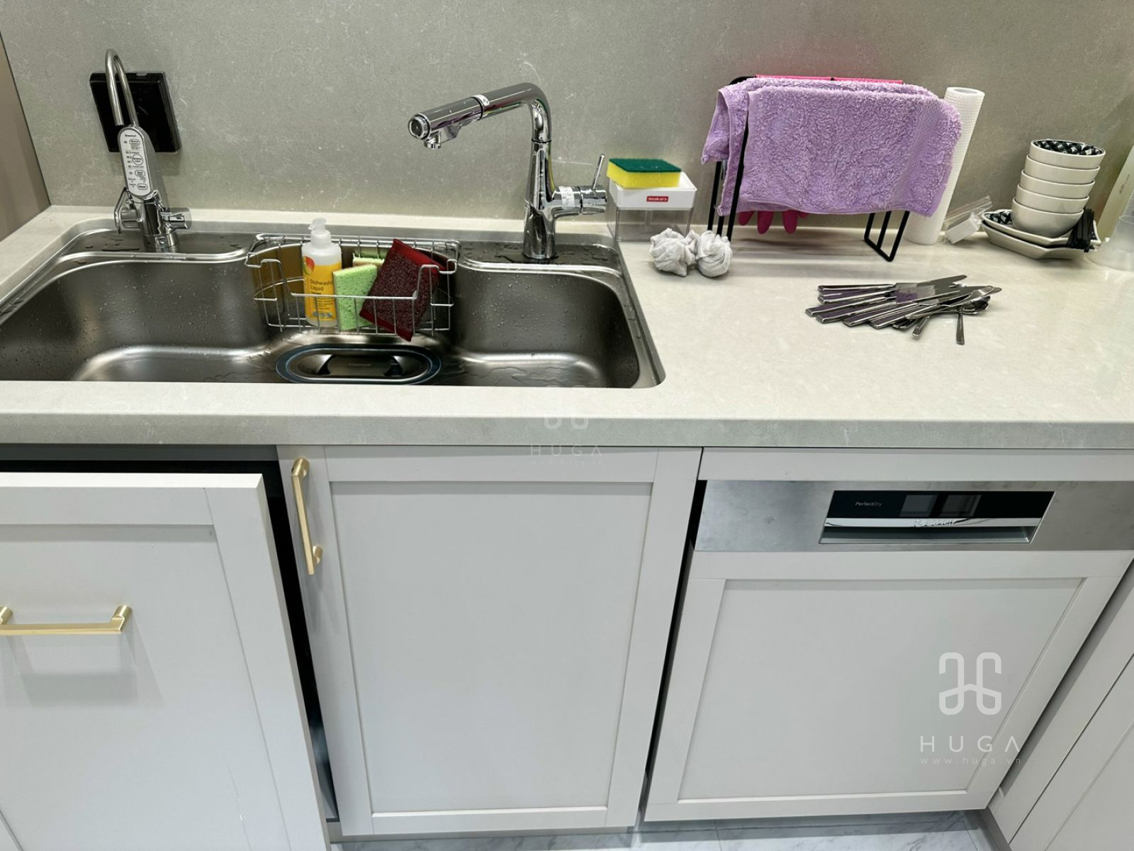 - Thiết kế chữ L nên tạo ra một khoảng trống phía trên vòi, phù hợp với nhà bếp có lắp đặt kệ chén nâng hạ.